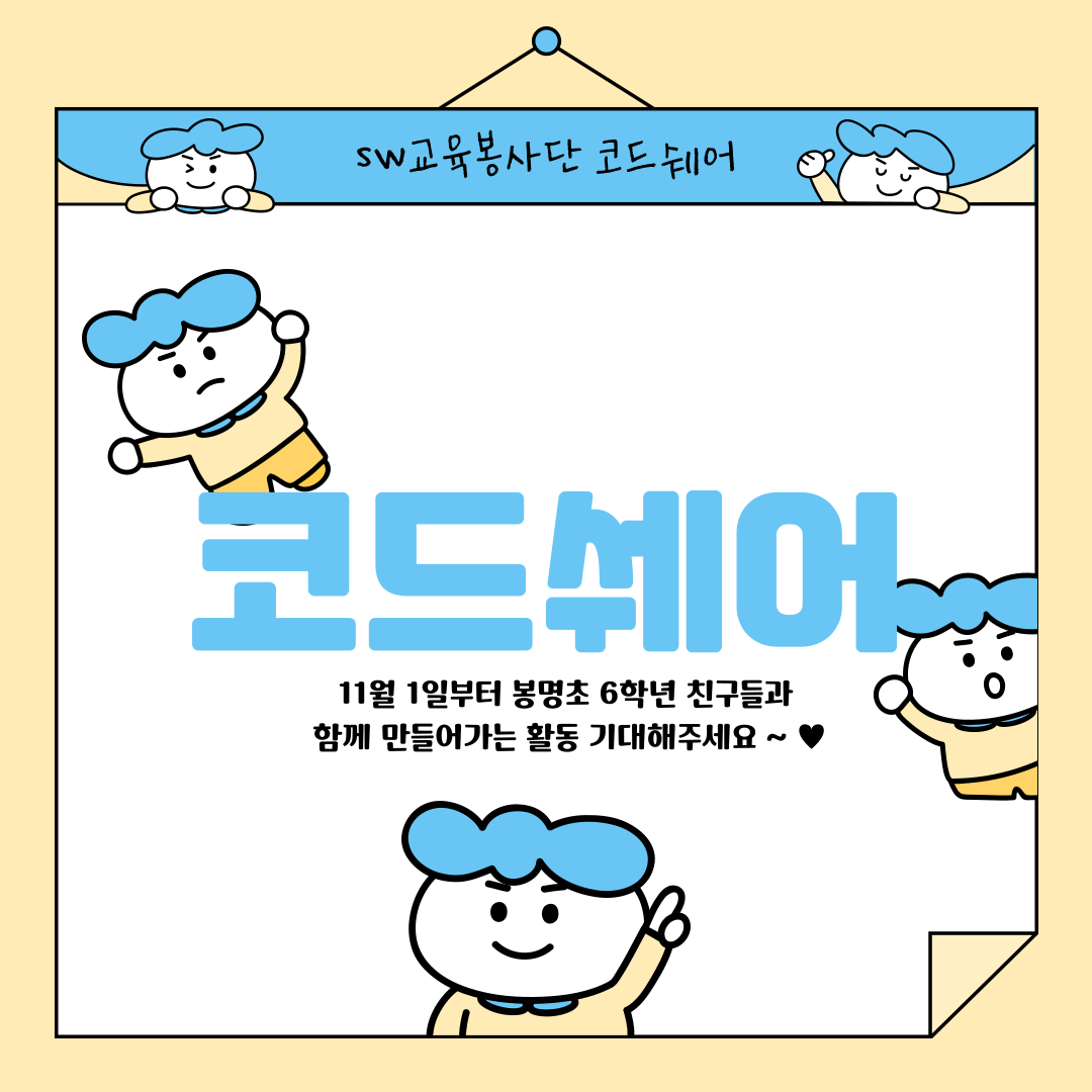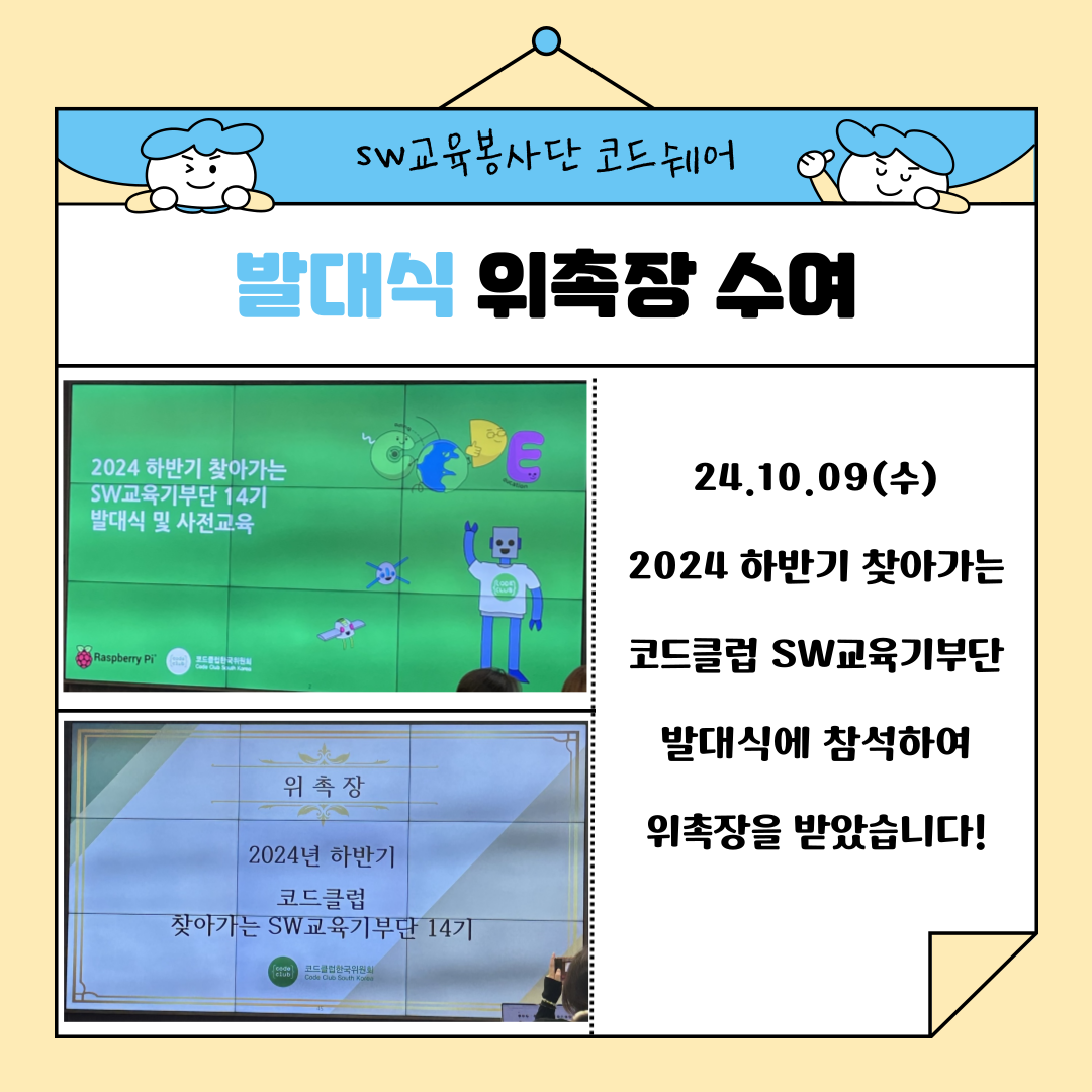 | [코드클럽 SW봉사단] 2024 하반기 코드쉐어 팀소개 (4) | 2024.10.11 |