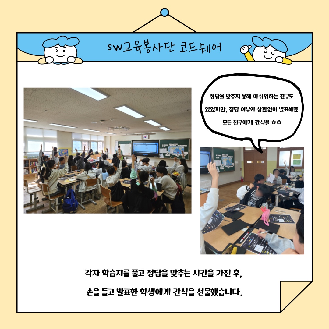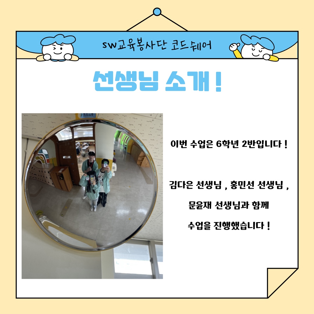 | [코드클럽 SW봉사단] 2024 하반기 코드쉐어 6학년 1반 1~4차시 수업 후기 (0) | 2024.11.30 |