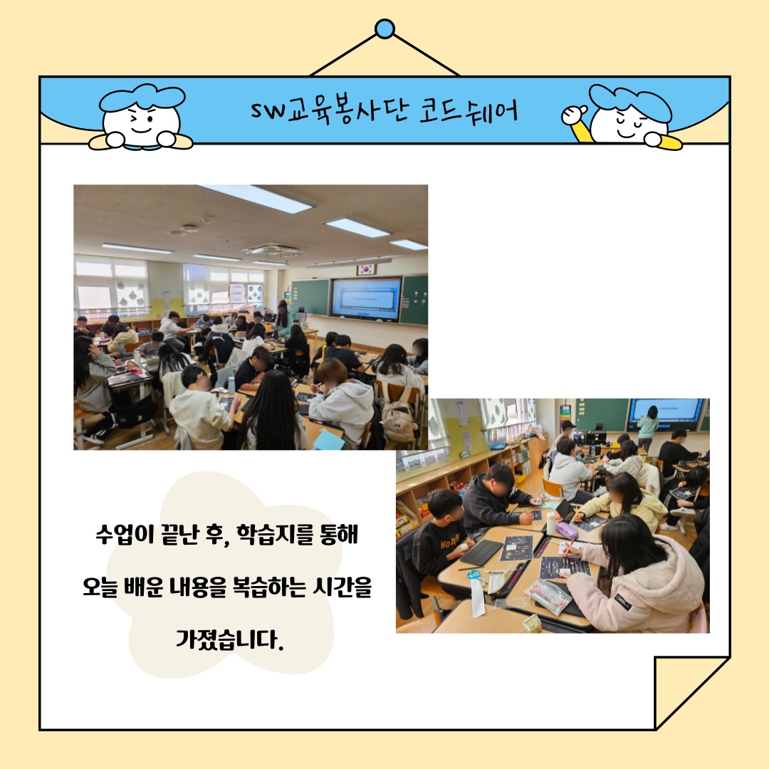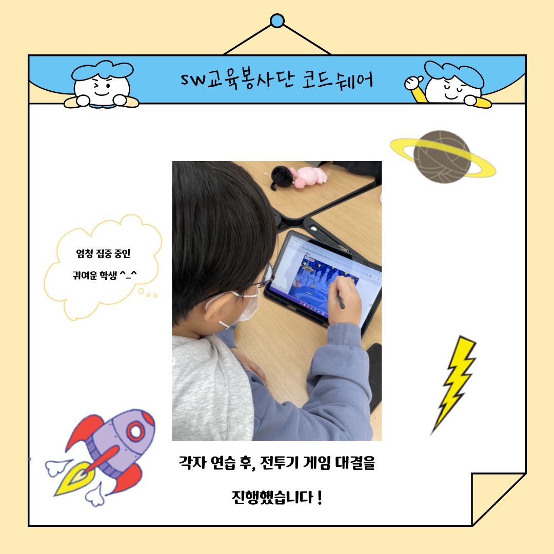 | [코드클럽 SW봉사단] 2024 하반기 코드쉐어 6학년 3반 1~4차시 수업 후기 (0) | 2024.12.01 |