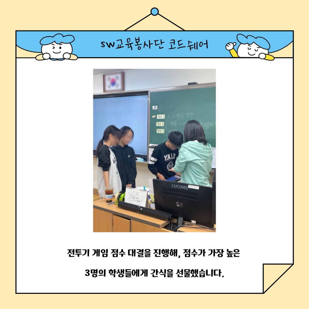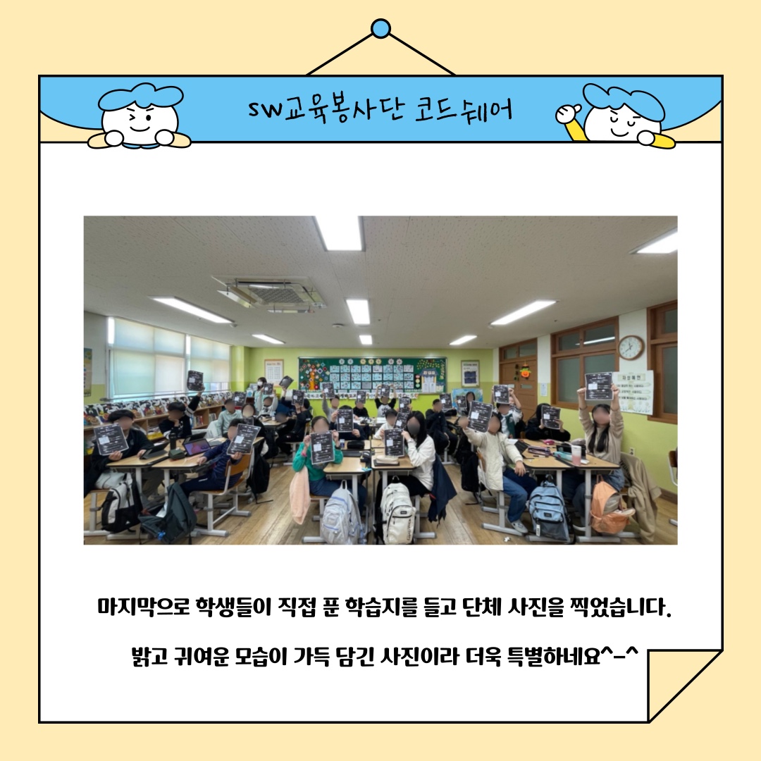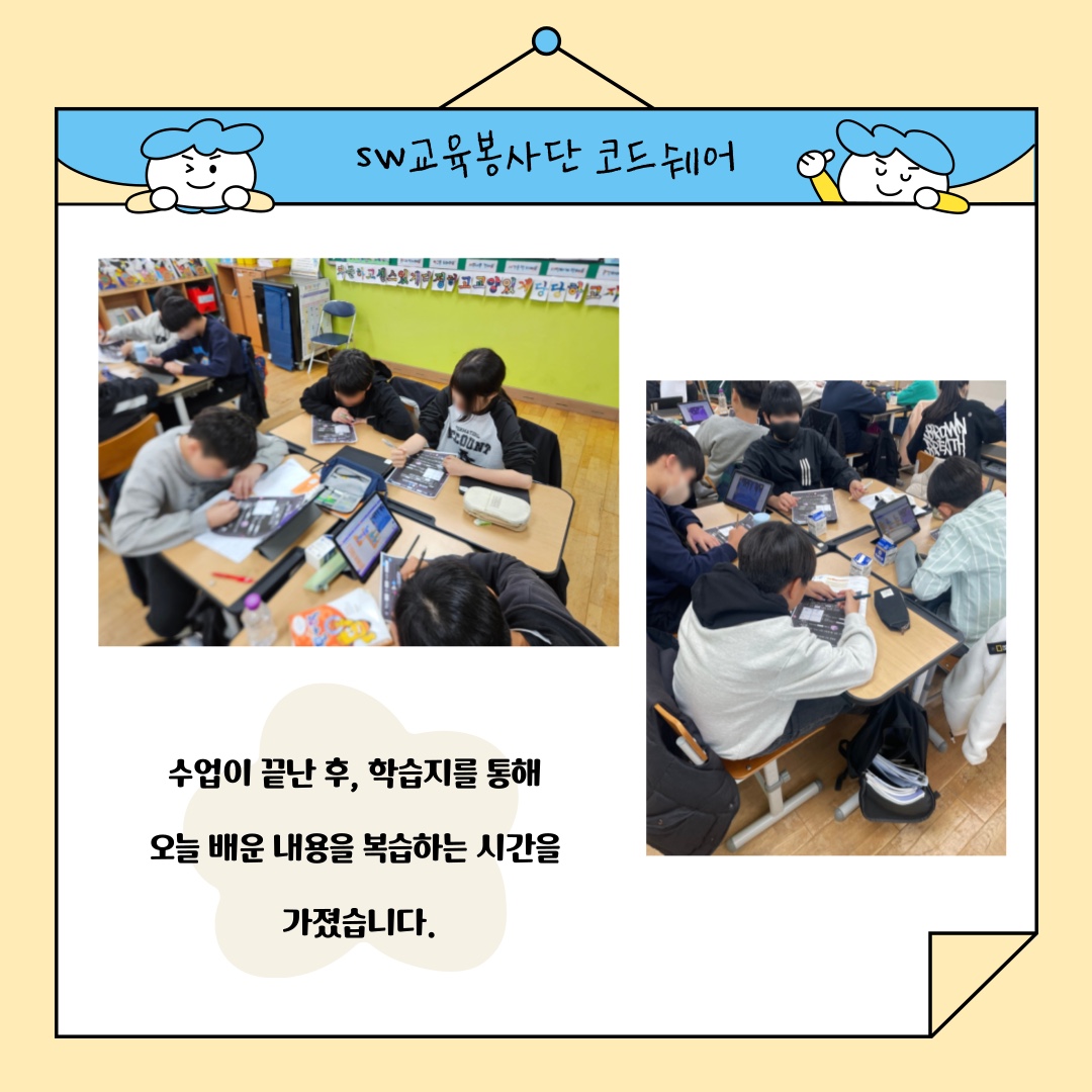 | [코드클럽 SW봉사단] 2024 하반기 코드쉐어 6학년 3반 1~4차시 수업 후기 (0) | 2024.12.01 |