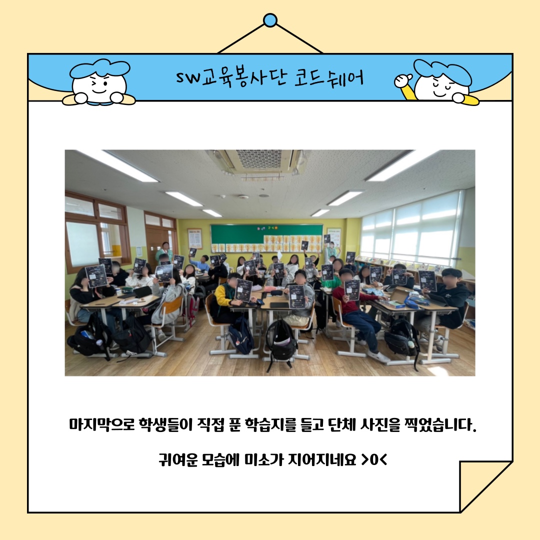 | [코드클럽 SW봉사단] 2024 하반기 코드쉐어 6학년 1반 5~6차시 수업 후기 (0) | 2024.12.05 |