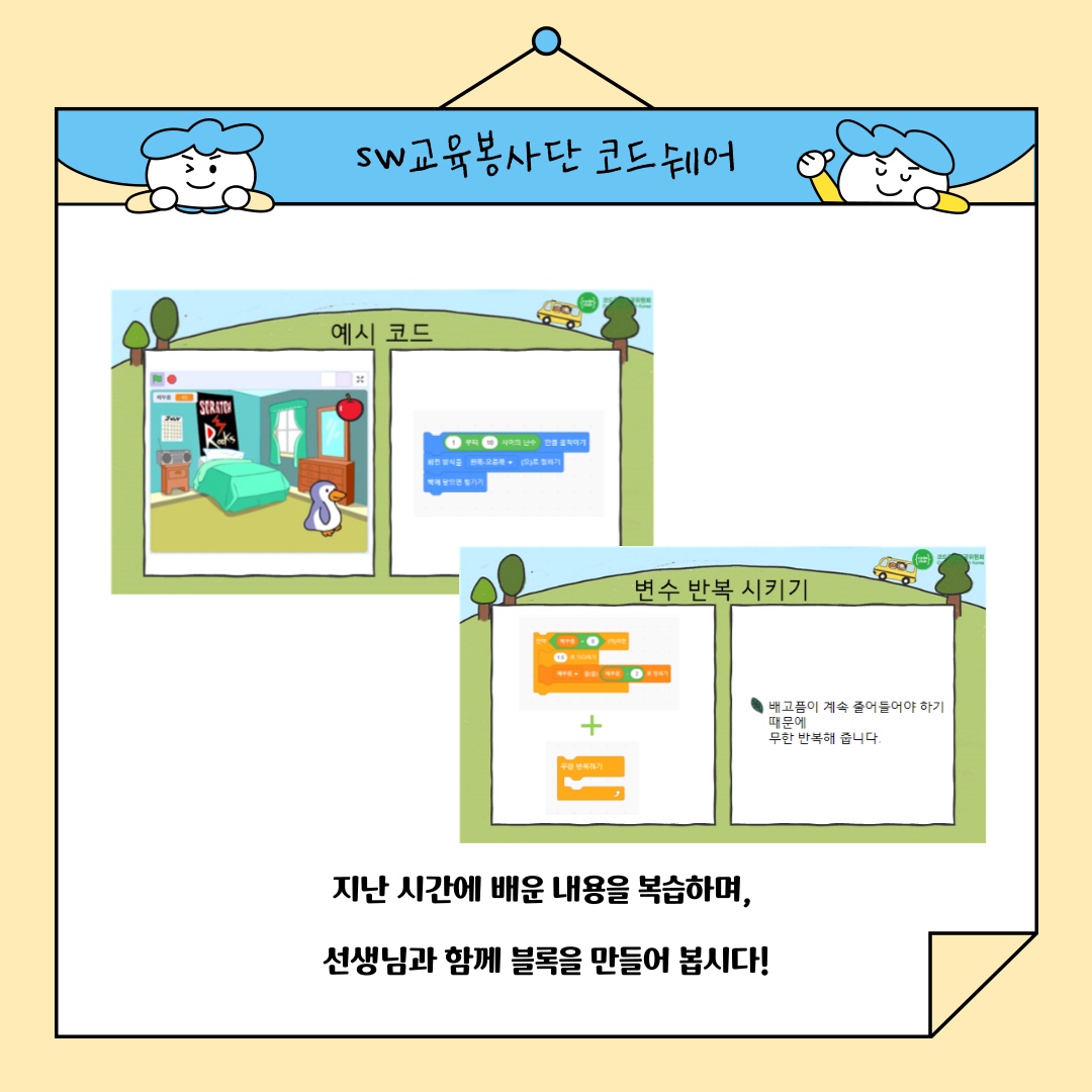 | [코드클럽 SW봉사단] 2024 하반기 코드쉐어 6학년 1반 5~6차시 수업 후기 (0) | 2024.12.05 |
