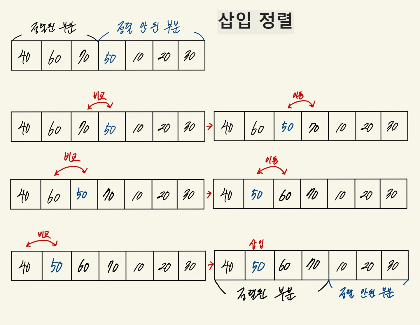 -배열을 정렬된 부분(앞부분)과 정렬 안 된 부분(뒷부분)으로 나누고, 뒷부분의 가장 왼쪽 원소를 앞부분의 적절한 위치에 삽입하여 정렬되도록 하는 과정을 반복
